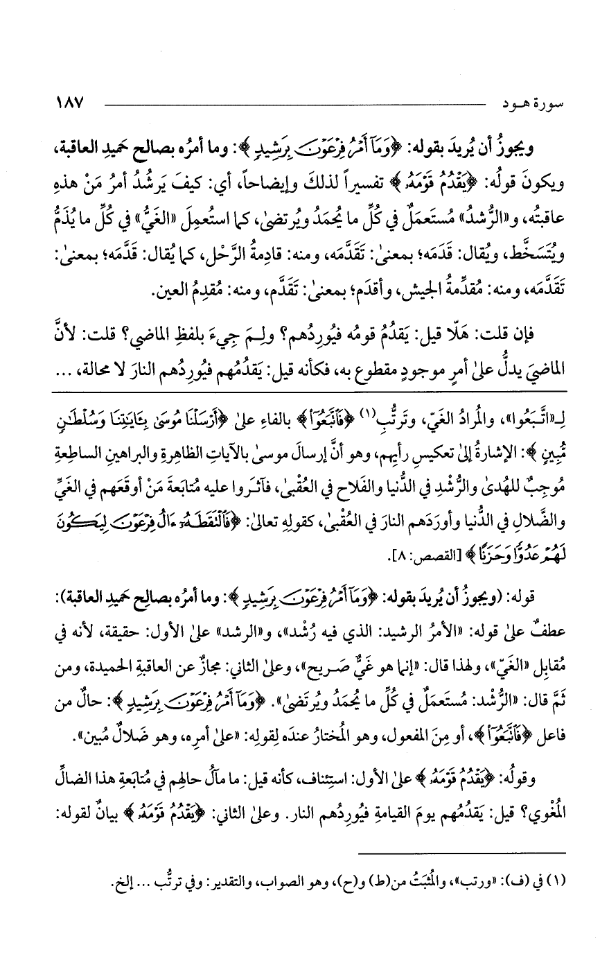 ويجوز أن يريد بقوله: (وَما أَمْرُ فِرْعَوْنَ بِرَشِيدٍ) وما أمره بصالح حميد العاقبة. ويكون قوله (يَقْدُمُ قَوْمَهُ) تفسيراً لذلك وإيضاحاً، أى: كيف يرشد أمر من هذه عاقبته. و"الرشد" مستعمل في كل ما يحمد ويرتضى، كما استعمل "الغيّ" في كل ما يذم ويتسخط. ويقال: قدمه بمعنى: تقدّمه. ومنه: قادمة الرجل، كما يقال: قدمه بمعنى تقدّمه. ومنه مقدّمة الجيش. وأقدم بمعنى تقدّم. ومنه مقدّم العين.
