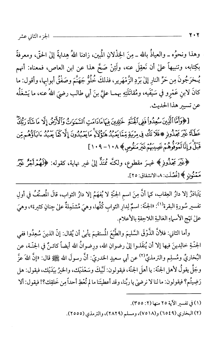 وأما الثاني: فلأن الذوق السليم والطبع المستقيم يأبى أن يقال: إن الذين سعدوا ففي الجنة خالدين فيها إلا أن ينقلوا إلى رضوان الله، ورضوان الله أيضاً كائن في الجنة، عن البخاري ومسلم والترمذي عن أبي سعيد الخدري: أن رسول الله صلى الله عليه وسلم قال: "إن الله عز وجل يقول لأهل الجنة: يا أهل الجنة، فيقولون: لبيك وسعديك، والخير بيديك، فيقول: هل رضيتم؟ فيقولون: ما لنا لا نرضى يا ربنا، وقد أعطيتنا ما لم تعط أحداً من خلقك؟ ! فيقول: ألا