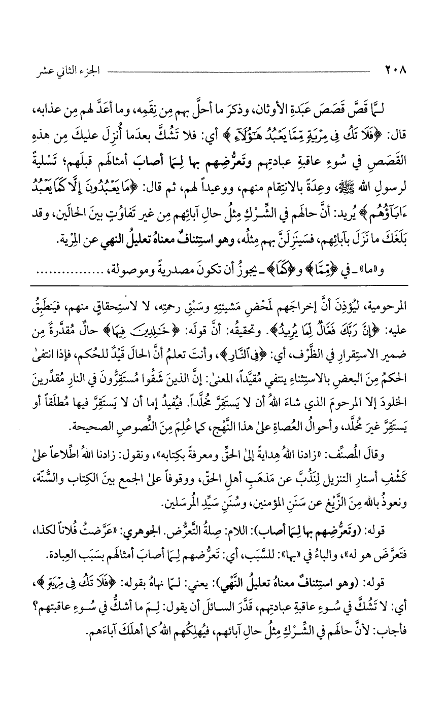 قوله: (وهو استئناف معناه تعليل النهي): يعني: لما نهاه بقوله: (فَلا تَكُ فِي مِرْيَةٍ)، أي: لا تشك في سوء عاقبة عبادتهم، قدر السائل أن يقول: لم ما أشك في سوء عاقبتهم؟ فأجاب: لأن حالهم في الشرك مثل حال آبائهم، فيهلكهم الله كما أهلك آباءهم.