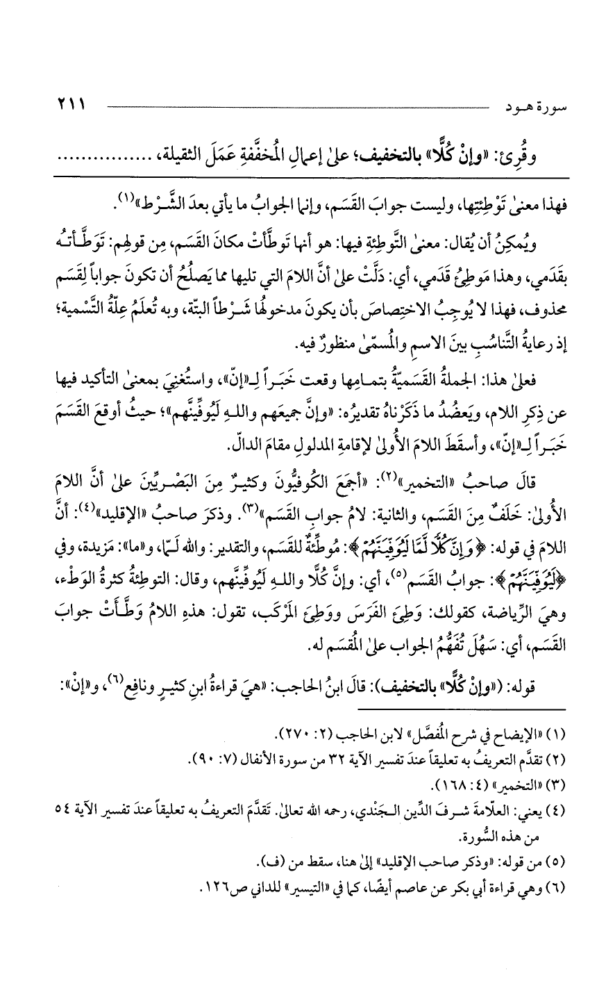 فعلى هذا: الجملة القسمية بتمامها وقعت خبراً لـ "إن"، واستغني بمعنى التأكيد فيها عن ذكر اللام، ويعضد ما ذكرناه تقديره: "وإن جميعهم والله ليوفينهم"؛ حيث أوقع القسم خبراً لـ "إن"، واسقط اللام الأولى لإقامة المدلول مقام الدال.