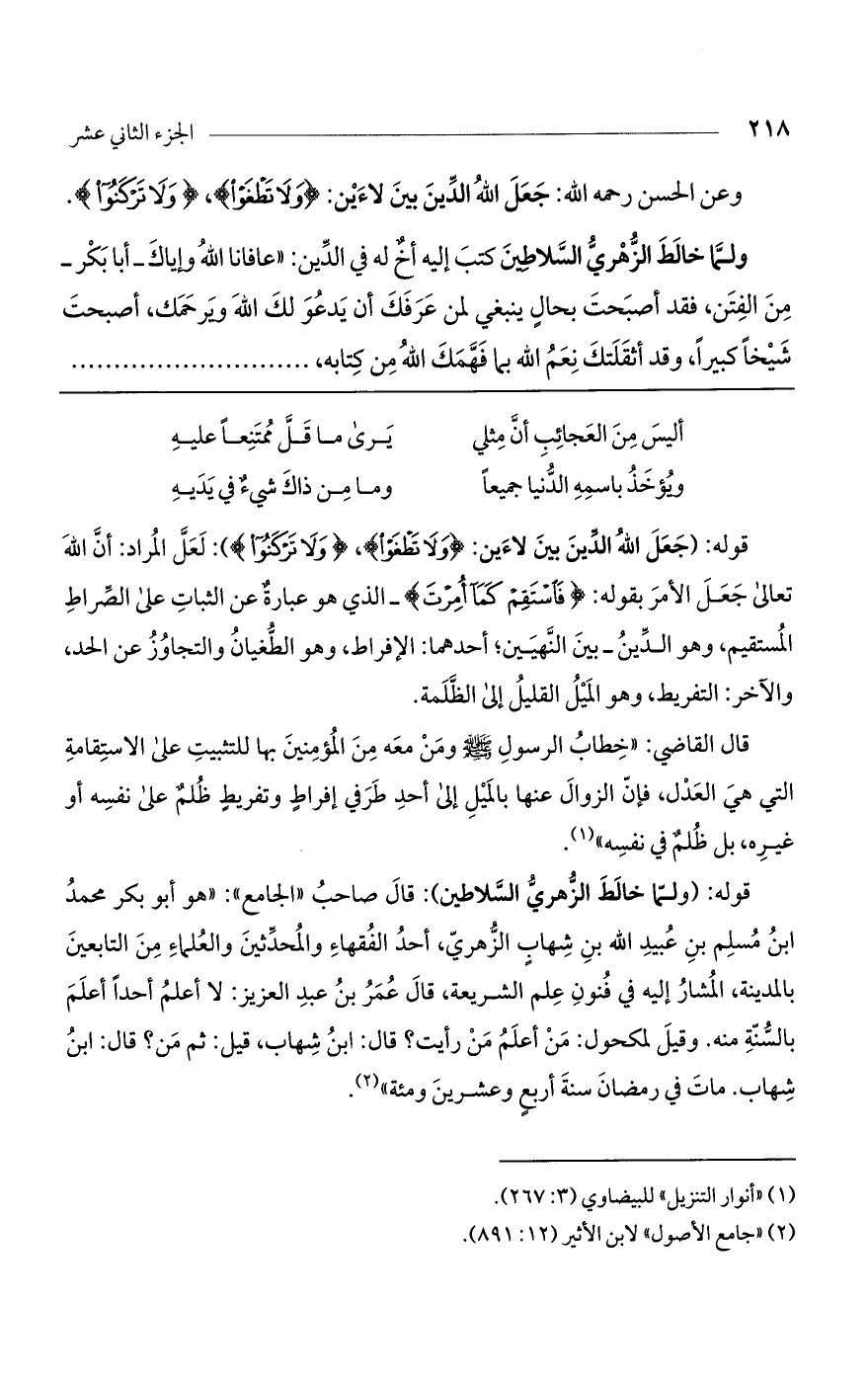 وعن الحسن رحمه الله: جعل الله الدين بين لاءين: (وَلا تَطْغَوْا)، (وَلا تَرْكَنُوا).