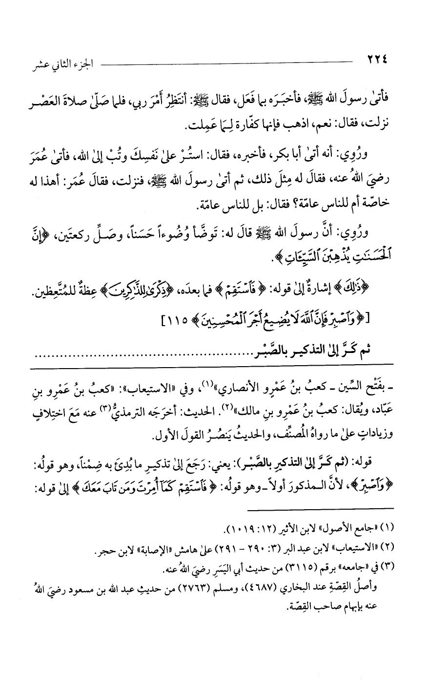 قوله: (ثم كر إلى التذكير بالصبر): يعني: رجع إلى تذكير ما بدئ به ضمناً، وهو قوله: (وَاصْبِرْ)، لأن المذكور أولاً- وهو قوله: (فَاسْتَقِمْ كَمَا أُمِرْتَ وَمَنْ تَابَ مَعَكَ) إلى قوله:
