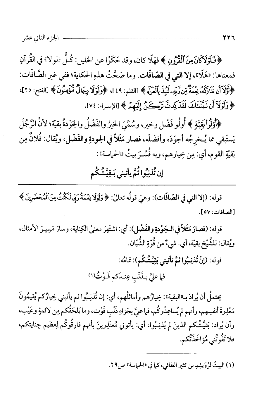 (فَلَوْلا كانَ مِنَ الْقُرُونِ) فهلا كان. وقد حكوا عن الخليل: كل «لولا» في القرآن فمعناها «هلا» إلا التي في الصافات، وما صحت هذه الحكاية ففي غير الصافات (لَوْلا أَنْ تَدارَكَهُ نِعْمَةٌ مِنْ رَبِّهِ لَنُبِذَ بِالْعَراءِ) [القلم: 49]، (وَلَوْلا رِجالٌ مُؤْمِنُونَ) [الفتح: 25]، (وَلَوْلا أَنْ ثَبَّتْناكَ لَقَدْ كِدْتَ تَرْكَنُ إِلَيْهِمْ) [الإسراء: 74].