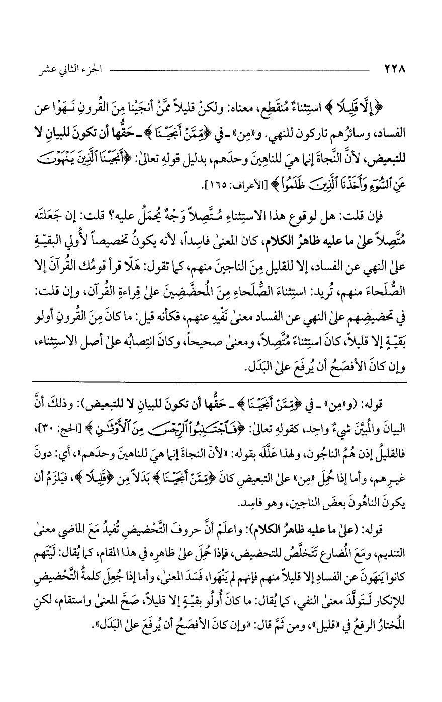 هلا قرأ قومك القرآن إلا الصلحاء منهم، تريد استثناء الصلحاء من المحضضين على قراءة القرآن وإن قلت في تحضيضهم على النهي عن الفساد معنى نفيه عنهم، فكأنه قيل: ما كان من القرون أولو بقية إلا قليلاً، كان استثناء متصلاً ومعنى صحيحاً، وكان انتصابه على أصل الاستثناء، وإن كان الأفصح أن يرفع على البدل.