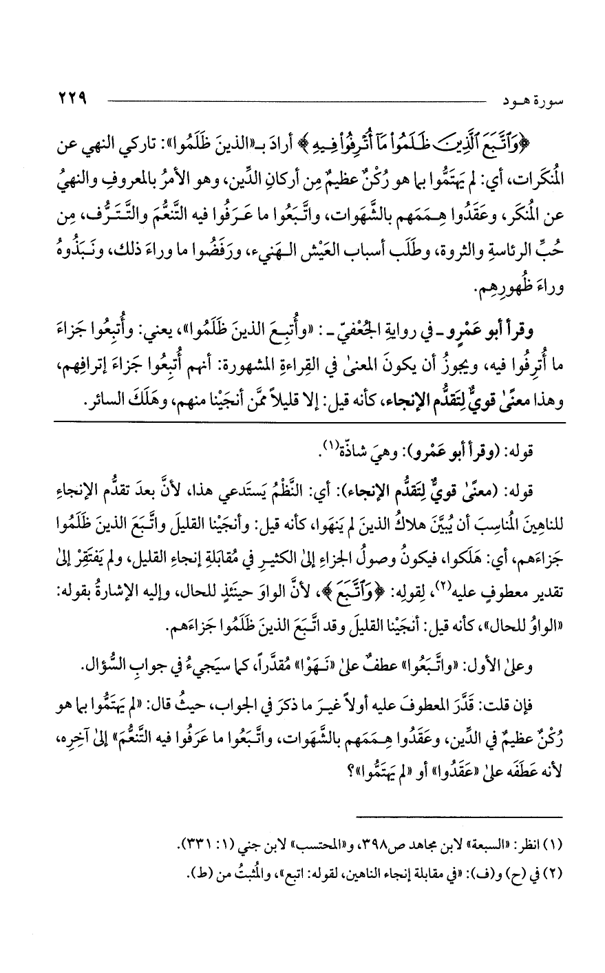 (وَاتَّبَعَ الَّذِينَ ظَلَمُوا ما أُتْرِفُوا فِيهِ) أراد بـ"الذين ظلموا": تاركي النهي عن المنكرات، أي: لم يهتموا بما هو ركن عظيم من أركان الدين، وهو الأمر بالمعروف والنهي عن المنكر، وعقدوا هممهم بالشهوات، واتبعوا ما عرفوا فيه التنعم والتترف، من حب الرياسة والثروة، وطلب أسباب العيش الهنيء. ورفضوا ما وراء ذلك ونبذوه وراء ظهورهم.