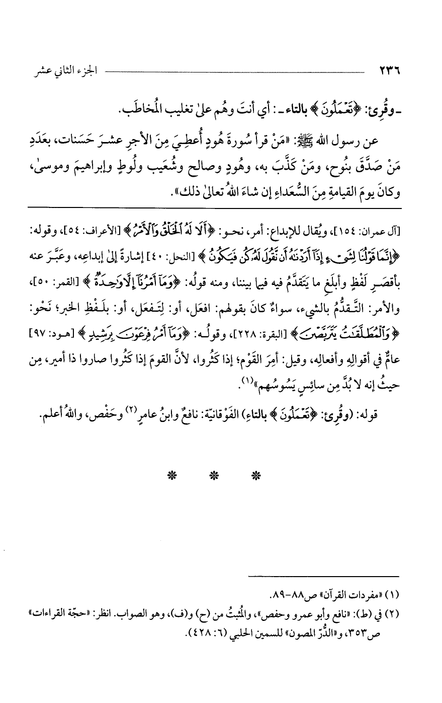 قوله: (وقرئ: (تَعْمَلُونَ) بالتاء) الفوقانية: نافع وابن عامر وحفص، والله أعلم.