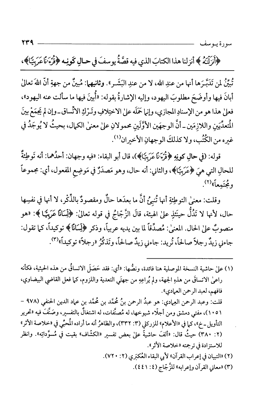 قوله: (في حال كونه (قُرْآناً عَرَبِيّاً))، قال أبو البقاء: "فيه وجهان: أحدهما: أنه توطئة للحال التي هي (عَرَبِيّاً)، والثاني: أنه حال، وهو مصدر في موضع المفعول، أي: مجموعاً ومجتمعاً".