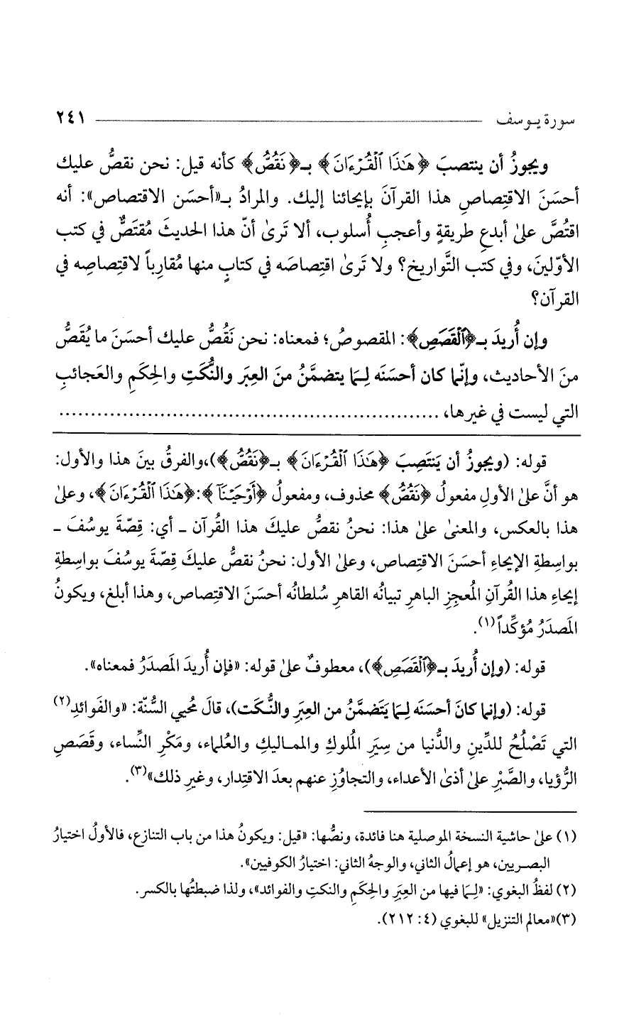 قوله: (ويجوز أن ينتصب (هَذَا الْقُرْآنُ) بـ (نَقُصُّ))، والفرق بين هذا والأول: هو أن على الأول مفعول (نَقُصُّ) محذوف، ومفعول (أَوْحَيْنَا): (هَذَا الْقُرْآنُ)، وعلى هذا بالعكس، والمعنى على هذا: نحن نقص عليك هذا القرآن- أي: قصة يوسف- بواسطة الإيحاء أحسن الاقتصاص، وعلى الأول: نحن نقص عليك قصة يوسف بواسطة إيحاء هذا القرآن المعجز الباهر تبيانه القاهر سلطانه أحسن الاقتصاص، وهذا أبلغ، ويكون المصدر مؤكداً.