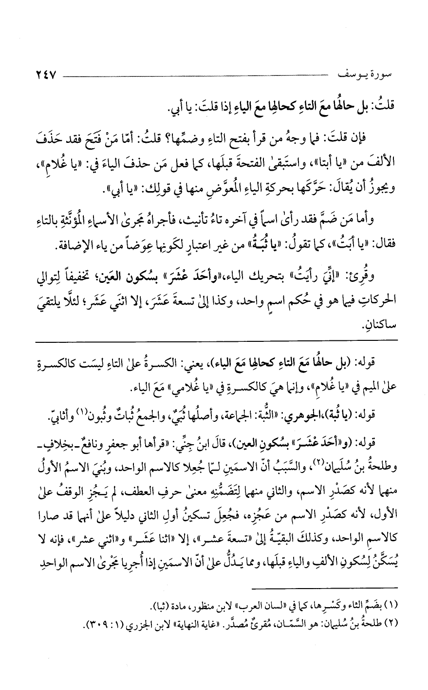 فإن قلت: فما وجه من قرأ بفتح التاء وضمها؟ قلت: أما من فتح فقد حذف الألف من «يا أبتا» واستبقى الفتحة قبلها، كما فعل من حذف الياء في «يا غلام» ويجوز أن يقال: حركها بحركة الباء المعوض منها في قولك «يا أبي».