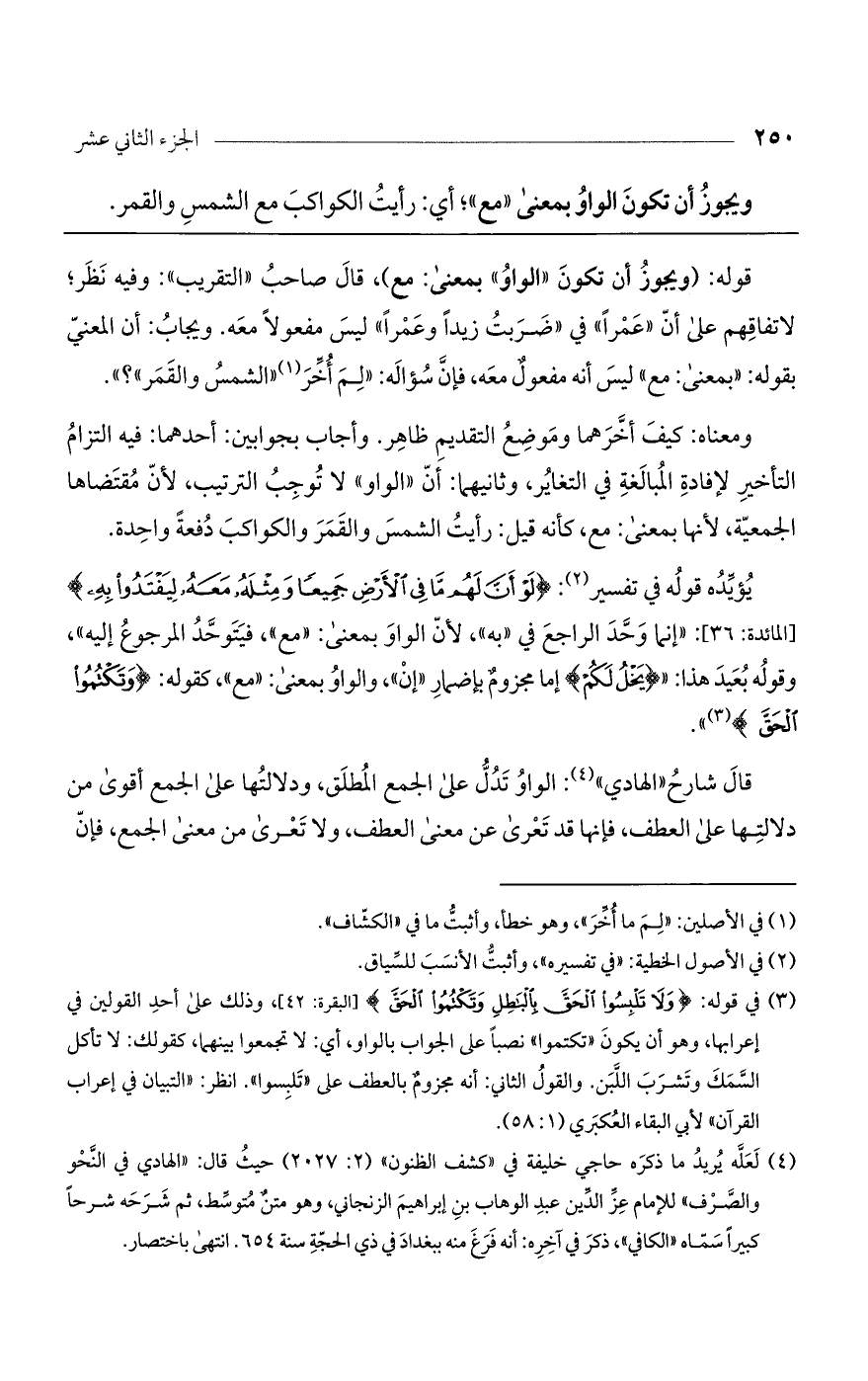 قوله: (ويجوز أن تكون "الواو" بمعنى: مع)، قال صاحب "التقريب": وفيه نظر؛ لاتفاقهم على أن "عمراً" في "ضربت زيداً وعمراً" ليس مفعولاً معه. ويجاب: أنا لمعني بقوله: "بمعنى: مع" ليس أنه مفعول معه، فإن سؤاله: "لم أخر "الشمس والقمر"؟ ".