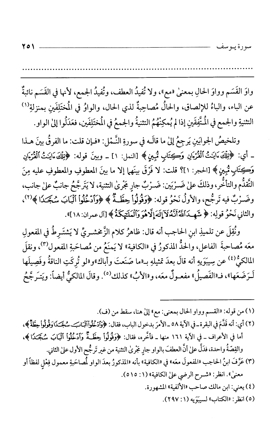 واو القسم وواو الحال بمعنى "مع"، ولا تفيد العطف، وتفيد الجمع، لأنها في القسم نائبة عن الباء، والباء للإلصاق، والحال مصاحبة لذي الحال، والواو في المختلفين بمنزلة التثنية والجمع في المتفقين إذا لم يمكنهم التثنية والجمع في المختلفين، فعدلوا إلى الواو.