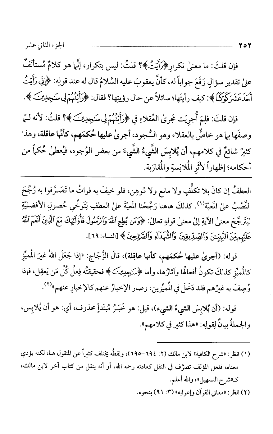 قوله: (أجرى عليها حكمهم، كأنها عاقلة)، قال الزجاج: "إذا جعل الله غير المميز كالمميز كذلك تكون أفعالها وآثارها، وأما (سَاجِدِينَ) فحقيقته فعل كل من يعقل، فإذا وصف به غيرهم فقد دخل في المميزين، وصار الإخبار عنهم كالإخبار عنهم".