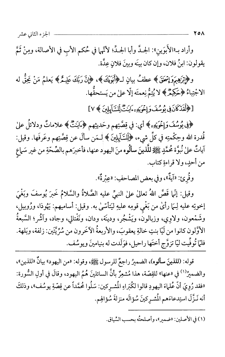 (فِي يُوسُفَ وَإِخْوَتِهِ) أي: في قصتهم وحديثهم (آياتٌ) علامات ودلائل على قدرة الله وحكمته في كل شيء (لِلسَّائِلِينَ) لمن سأل عن قصتهم وعرفها. وقيل: آيات على نبوّة محمد صلى الله عليه وسلم للذين سألوه من اليهود عنها، فأخبرهم بالصحة من غير سماع من أحد ولا قراءة كتاب.