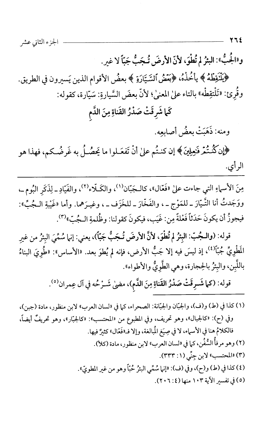 من الأسماء التي جاءت على "فعال"، كالجبان، والكلاء، والفياد- لذكر البوم-، ووجدت أنا التيار- للموج-، والفخار- للخزف-، وغيرها. وأما "غيبة الجب": فيجوز أن يكون حدثاً فعلة من: غيب، فيكون كقولنا: وظلمة الجب".