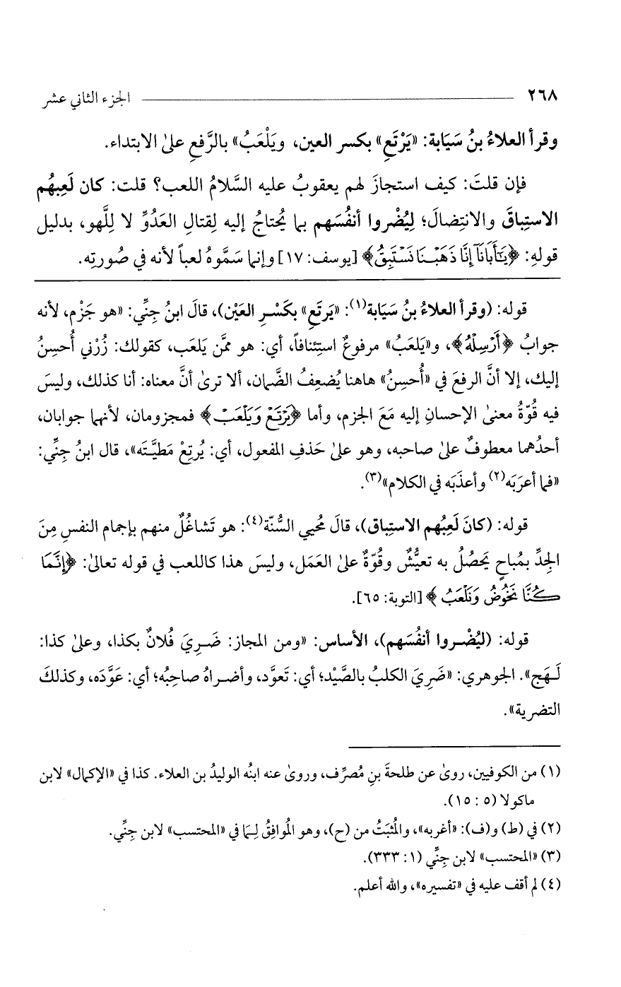 قوله: (وقرأ العلاء بن سيابة: "يرتع" بكسر العين)، قال ابن جني: "هو جزم، لأنه جواب (أَرْسِلْهُ)، و"يلعب" مرفوع استئنافاً، أي: هو ممن يلعب، كقولك: زرني أحسن إليك، إلا أن الرفع في "أحسن" ها هنا يضعف الضمان، ألا ترى أن معناه: أنا كذلك، وليس فيه قوة معنى الإحسان إليه مع الجزم، وأما (يَرْتَعْ وَيَلْعَبْ) فمجزومان، لأنهما جوابان، أحدهما معطوف على صاحبه، وهو على حذف المفعول، أي: يرتع مطيته"، قال ابن جني: "فما أعربه وأعذبه في الكلام".
