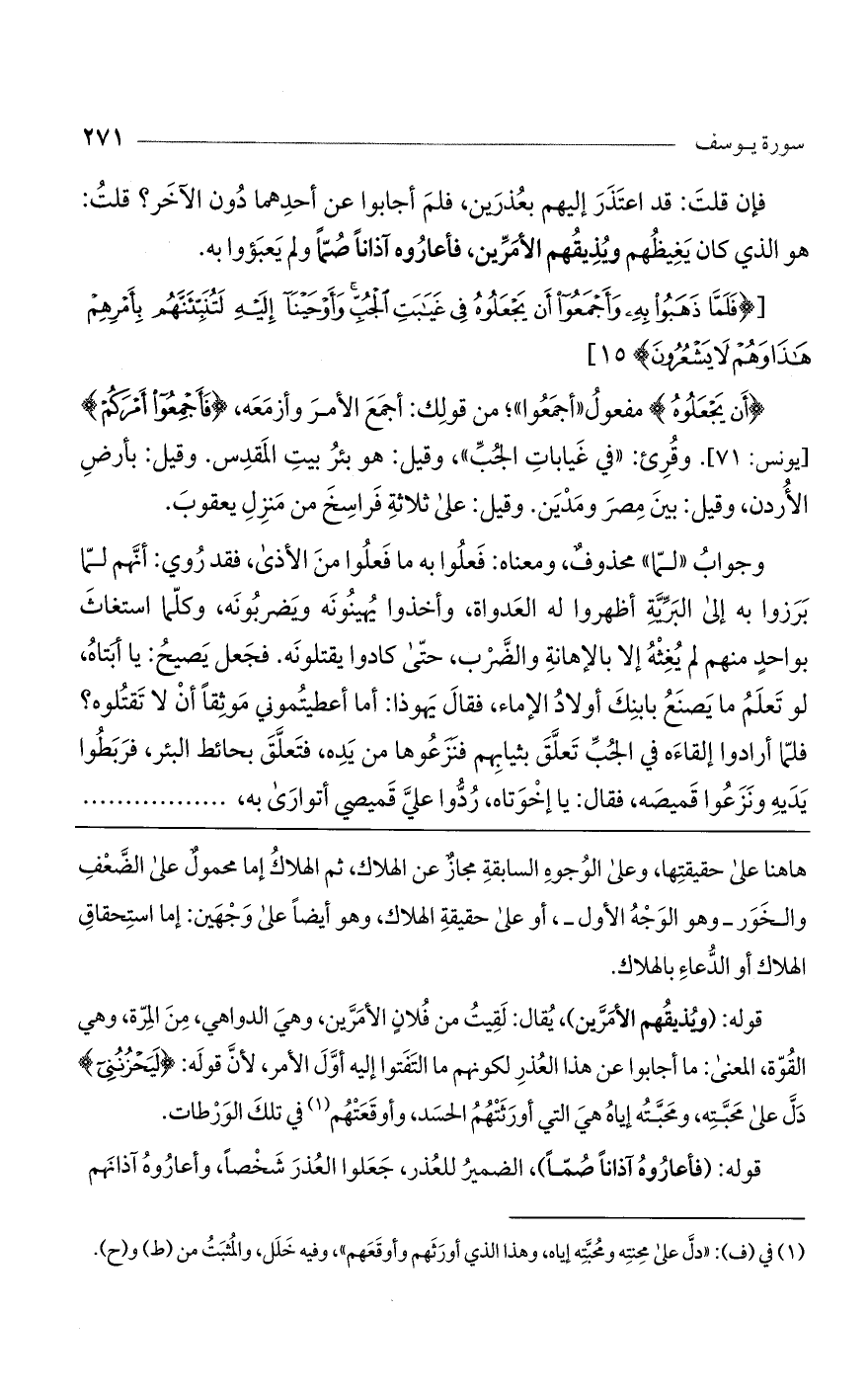 وجواب «لما» محذوفٌ. ومعناه: فعلوا به ما فعلوا من الأذى، فقد روي: أنهم لما برزوا به إلى البرّية أظهروا له العداوة وأخذوا يهنونه ويضربونه، وكلما استغاث بواحد منهم لم يغثه إلا بالإهانة والضرب، حتى كادوا يقتلونه. فجعل يصيح: يا أبتاه، لو تعلم ما يصنع بابنك أولاد الإماء، فقال يهوذا: أما أعطيتمونى موثقاً ألا تقتلوه فلما أرادوا إلقاءه في الجب تعلق بثيابهم فنزعوها من يده، فتعلق بحائط البئر فربطوا يديه ونزعوا قميصه، فقال: يا إخوتاه، ردّوا عليّ قميصي أتوارى به،