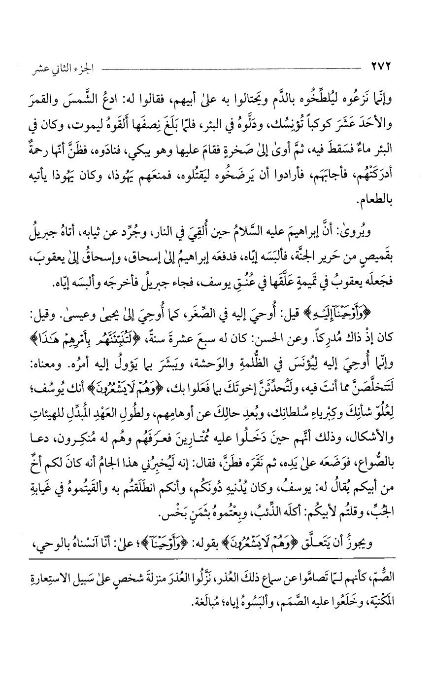 وإنما نزعوه ليلطخوه بالدم ويحتالوا به على أبيهم، فقالوا له: ادع الشمس والقمر والأحد عشر كوكبا تؤنسك، ودلوه في البئر، فلما بلغ نصفها ألقوه ليموت، وكان في البئر ماء فسقط فيه، ثم أوى إلى صخرة فقام عليها وهو يبكي، فنادوه فظنّ أنها رحمة أدركتهم، فأجابهم فأرادوا أن يرضخوه ليقتلوه فمنعهم يهوذا، وكان