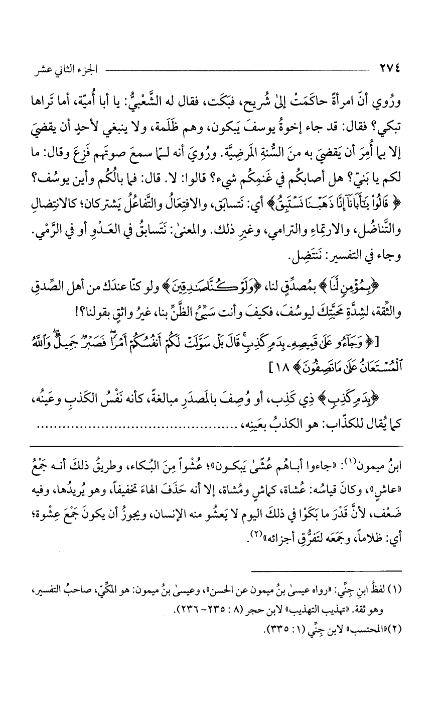 ابن ميمون: "جاءوا أباهم عشى يبكون"؛ عشوا من البكاء، وطريق ذلك أنه جمع "عاش"، وكان قياسه: عشاة، كماش ومشاة، إلا أنه حذف الهاء تخفيفاً، وهو يريدها، وفيه ضعف، لأن قدر ما بكوا في ذلك اليوم لا يعشو منه الإنسان، ويجوز أن يكون جمع عشوة؛ أي: ظلاماً، وجمعه لتفرق أجزائه".