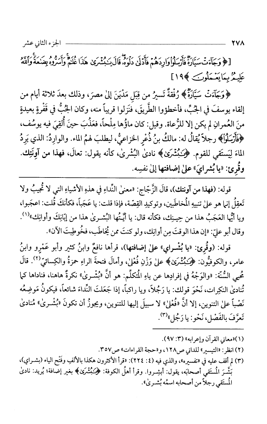 (وَجاءَتْ سَيَّارَةٌ) رفقة تسير من قبل مدين إلى مصر، وذلك بعد ثلاثة أيام من إلقاء يوسف في الجب، فأخطئوا الطريق فنزلوا قريباً منه، وكان الجب في قفرة بعيدة من العمران لم يكن إلا للرعاة. وقيل: كان ماؤها ملحاً. فعذب حين ألقى فيه يوسف (فَأَرْسَلُوا) رجلاً يقال له مالك بن ذعرٍ الخزاعي، ليطلب لهم الماء. والوارد: الذي يرد الماء ليستقي للقوم (يا بُشْرى) نادى البشرى، كأنه يقول: تعال، فهذا من آونتك. وقرئ: "يا بشراى" على إضافتها إلى نفسه.