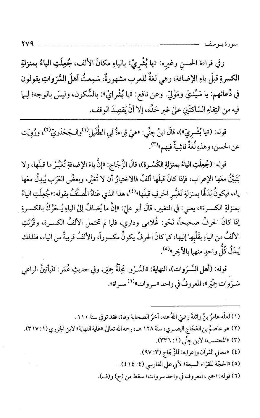 قوله: ("يا بشري")، قال ابن جني: "هي قراءة أبي الطفيل والجحدري، ورويت عن الحسن، وهذه لغة فاشية فيهم".