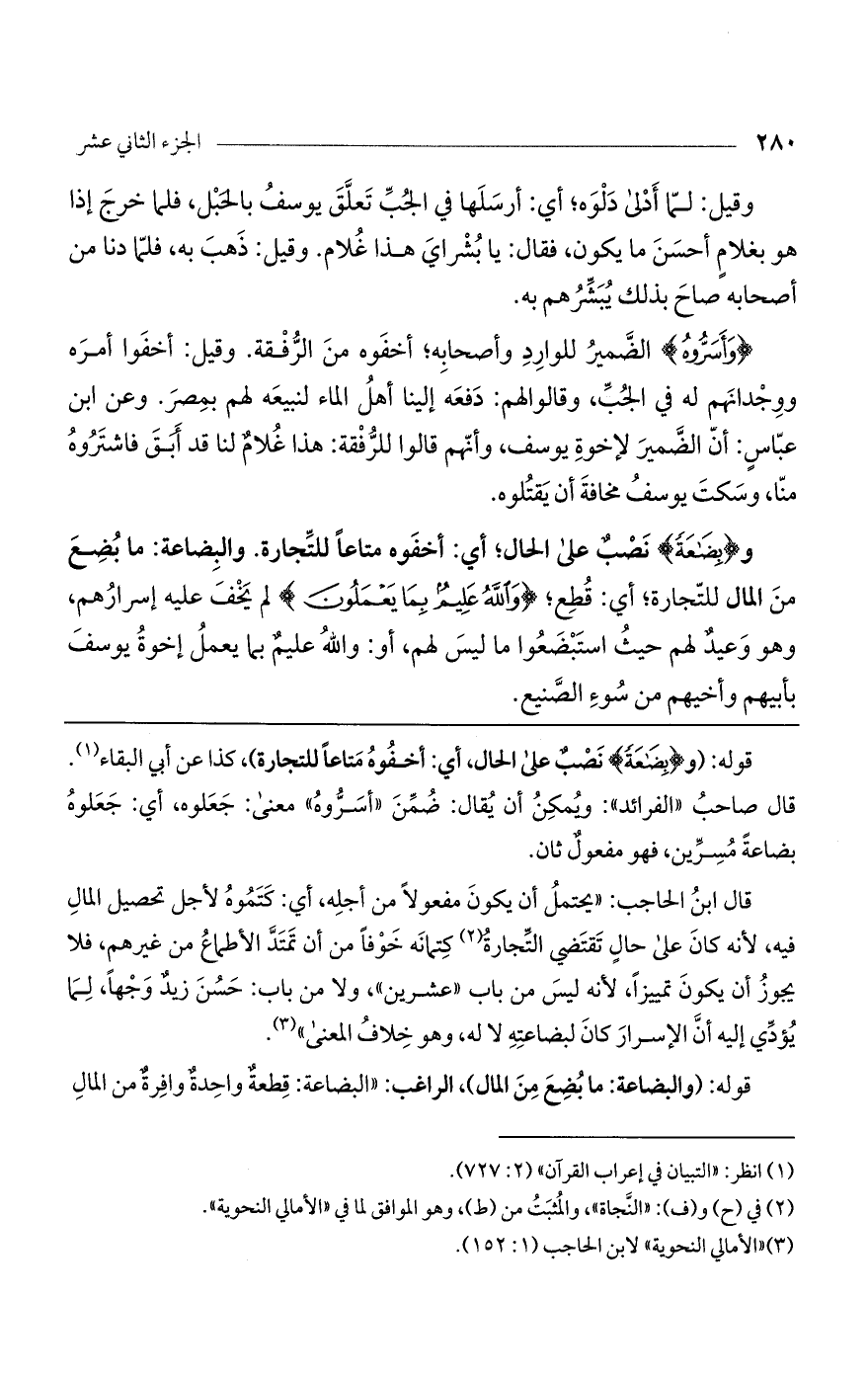 قوله: (و (بِضَاعَةً) نصب على الحال، أي: أخفوه متاعاً للتجارة)، كذا عن أبي البقاء. قال صاحب "الفرائد": ويمكن أن يقال: ضمن "أسروه" معنى: جعلوه، أي: جعلوه بضاعة مسرين، فهو مفعول ثان.