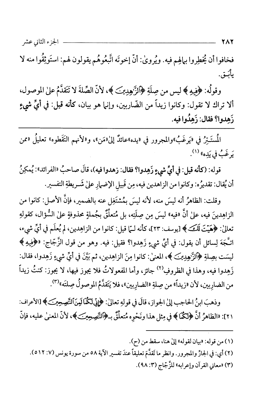 وقلت: الظاهر أنه ليس منه، لأنه ليس بمشتغل عنه بالضمير، فإن الأصل: كانوا من الزاهدين فيه، على أن "فيه" ليس من صلته، بل متعلق بجملة محذوفة على السؤال، كقوله تعالى: (هَيْتَ لَكَ) [يوسف: 23]، كأنه لما قيل: كانوا من الزاهدين، لم يعلم في أي شيء، اتجه لسائل أن يقول: في أي شيء زهدوا؟ فقيل: فيه. وهو من قول الزجاج: " (فِيهِ) ليست بصلة (الزَّاهِدِينَ)، المعنى: كانوا من الزاهدين، ثم بين في أي شيء زهدوا، فقال: زهدوا فيه، وهذا في الظروف جائز، وأما المفعولات فلا يجوز فيها، لا يجوز: كنت زيداً من الضاربين، لأن "زيداً" من صلة "الضاربين"، فلا يتقدم الموصول صلته".
