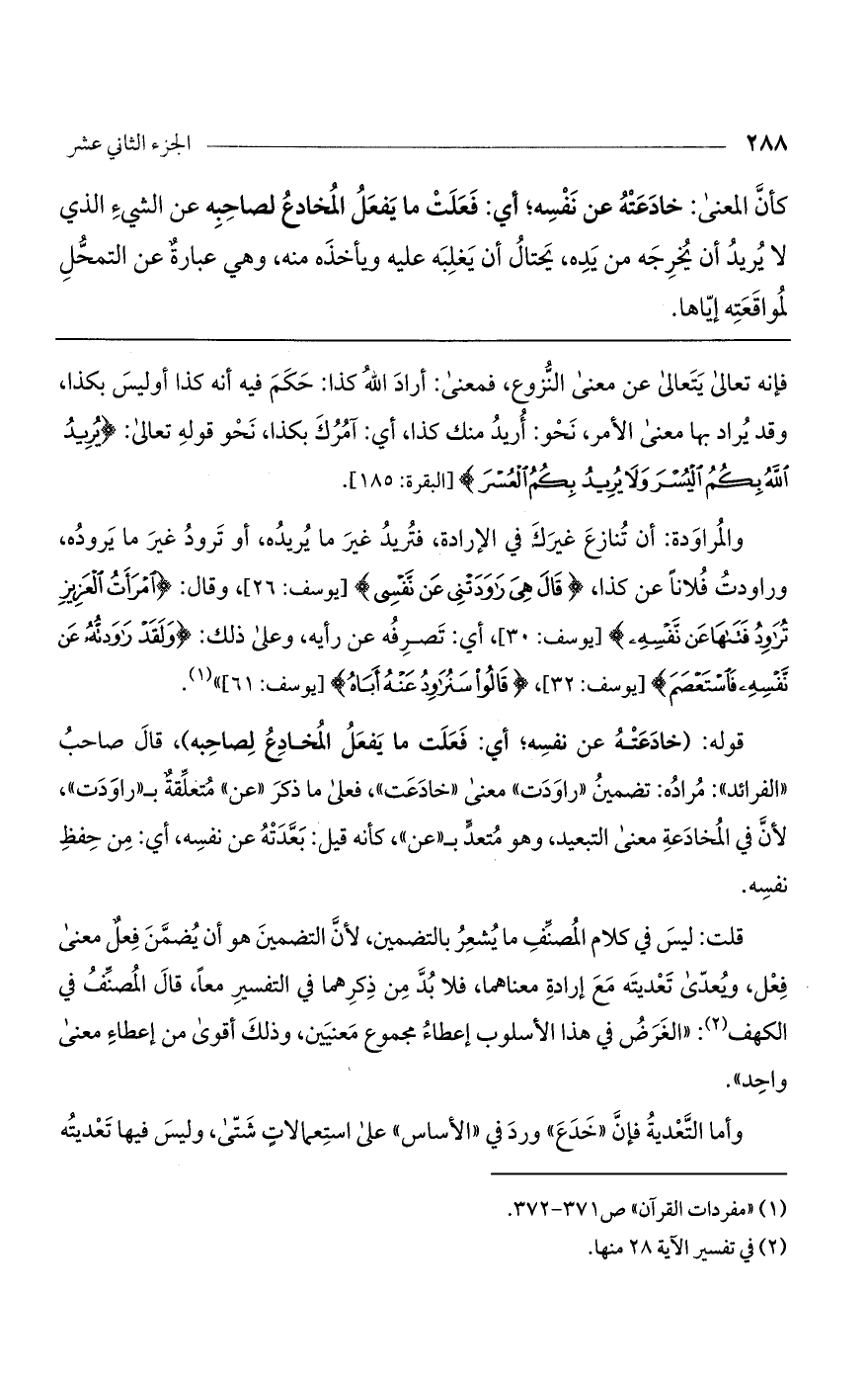 والمراودة: أن تنازع غيرك في الإرادة، فتريد غير ما يريده، أو ترود غير ما يروده، وراودت فلاناً عن كذا، (قَالَ هِيَ رَاوَدَتْنِي عَنْ نَفْسِي) [يوسف: 26]، وقال: (امْرَأَةُ الْعَزِيزِ تُرَاوِدُ فَتَاهَا عَنْ نَفْسِهِ) [يوسف: 30]، أي: تصرفه عن رأيه، وعلى ذلك: (وَلَقَدْ رَاوَدتُّهُ عَنْ نَفْسِهِ فَاسْتَعْصَمَ) [يوسف: 32]، (قَالُوا سَنُرَاوِدُ عَنْهُ أَبَاهُ) [يوسف: 61] ".