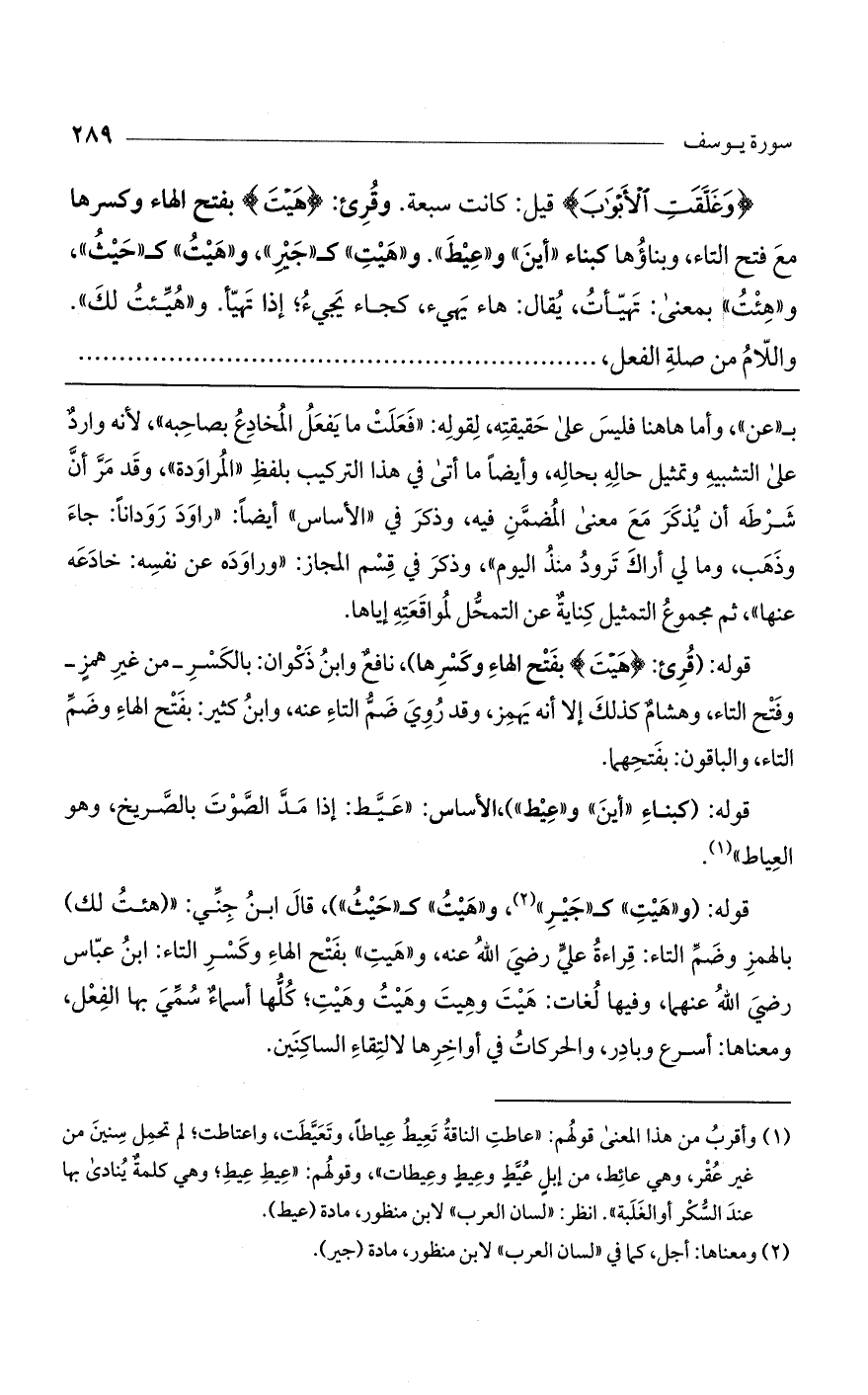 (وَغَلَّقَتِ الْأَبْوابَ) قيل: كانت سبعة. وقرئ (هَيْتَ) بفتح الهاء وكسرها مع فتح التاء، وبناؤه كبناء "أين" و"عيط". و"هيت" كـ"جير" و"هيت" كـ"حيث". وهثت بمعنى تهيأت. يقال: هاء يهيء، كجاء يجيء: إذا تهيأ. وهيئت لك. واللام من صلة الفعل،