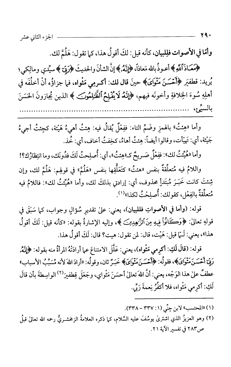 قوله: (وأما في الأصوات فللبيان)، يعني: على تقدير سؤال وجواب، كما سبق في قوله تعالى: (وَكَانُوا فِيهِ مِنْ الزَّاهِدِينَ)، وإليه الإشارة بقوله: "كأنه قيل: لك أقول هذا"، يعني: لما قيل: هيت، قال: لمن تقول: هيت؟ قال: لك أقول هذا.
