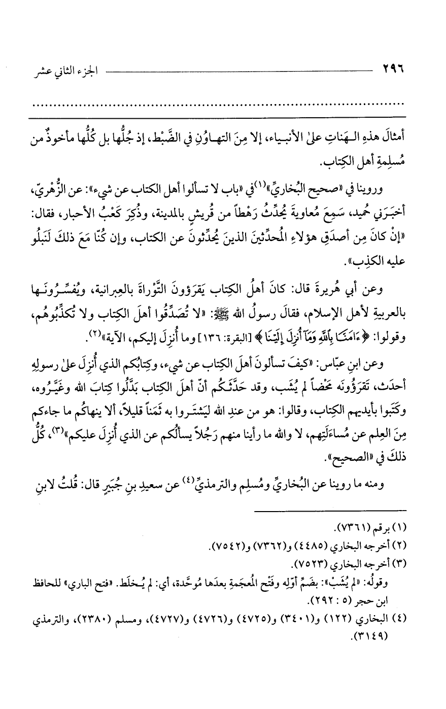 وروينا في "صحيح البخاري" في "باب لا تسألوا أهل الكتاب عن شيء": عن الزهري، أخبرني حميد، سمع معاوية يحدث رهطاً من قريش بالمدينة، وذكر كعب الأحبار، فقال: "إن كان من أصدق هؤلاء المحدثين الذين يحدثون عن الكتاب، وإن كنا مع ذلك لنبلو عليه الكذب".