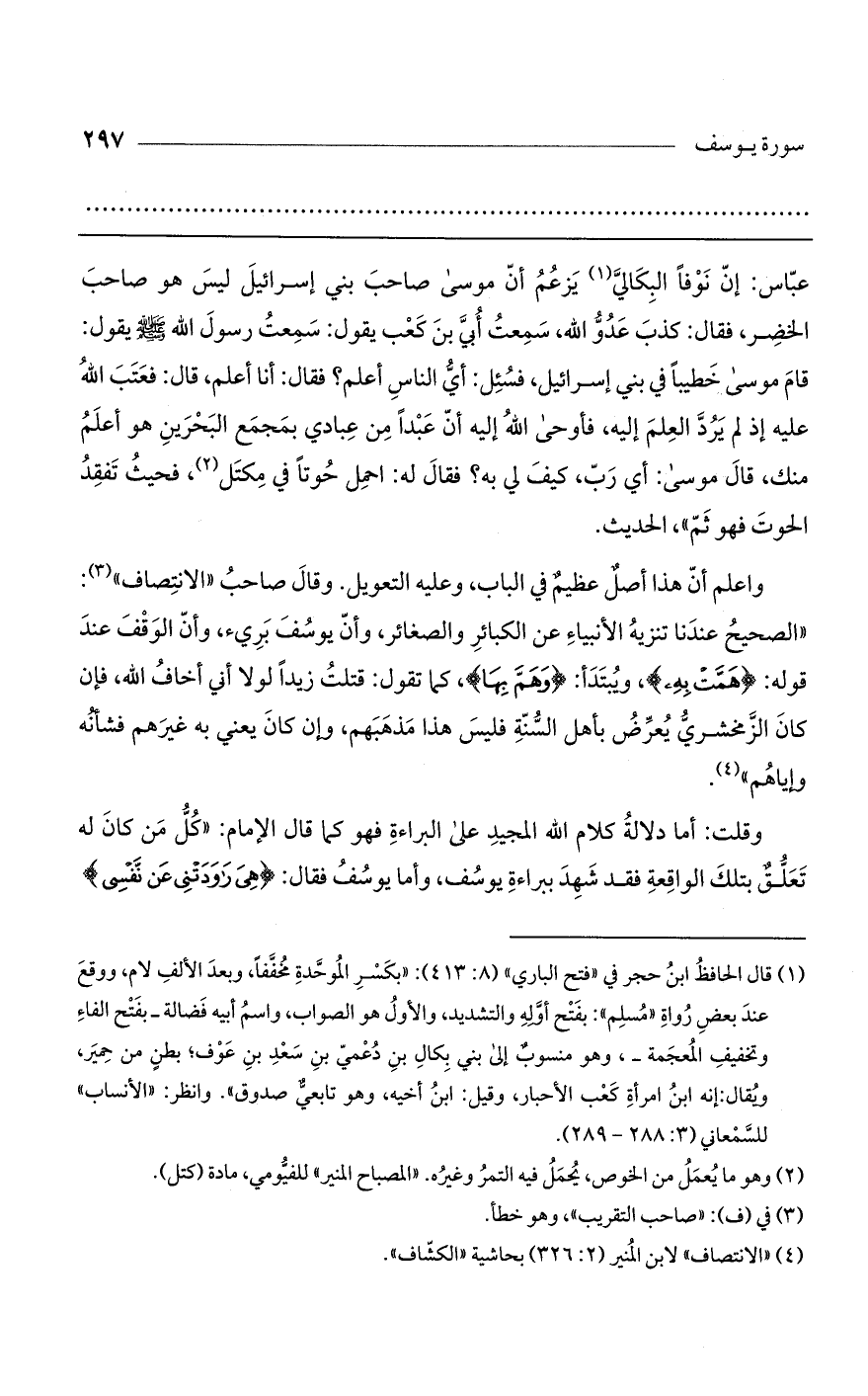 واعلم أن هذا أصل عظيم في الباب، وعليه التعويل. وقال صاحب "الانتصاف": "الصحيح عندنا تنزيه الأنبياء عن الكبائر والصغائر، وأن يوسف بريء، وأن الوقف عند قوله: (هَمَّتْ بِهِ)، ويبتدأ: (وَهَمَّ بِهَا)، كما تقول: قتلت زيداً لولا أني أخاف الله، فإن كان الزمخشري يعرض بأهل السنة فليس هذا مذهبهم، وإن كان يعني به غيرهم فشأنه وإياهم".