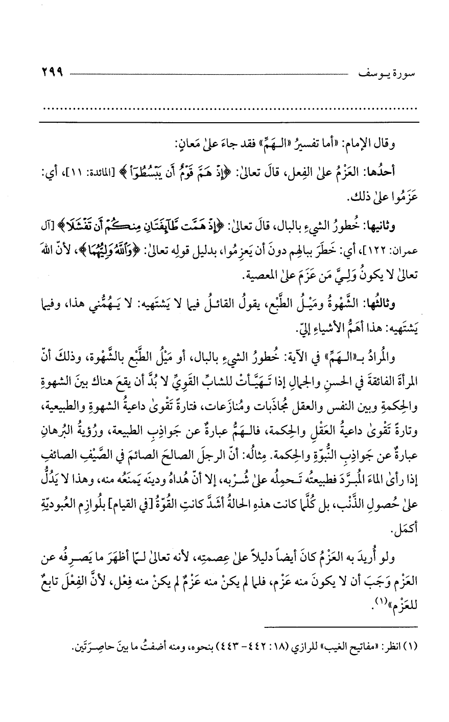 والمراد بـ "الهم" في الآية: خطور الشيء بالبال، أو ميل الطبع بالشهوة، وذلك أن المرأة الفائقة في الحسن والجمال إذا تهيأت للشاب القوي لابد أن يقع هناك بين الشهوة والحكمة وبين النفس والعقل مجاذبات ومنازعات، فتارة تقوى داعية الشهوة والطبيعية، وتارة تقوى داعية العقل والحكمة، فالهم عبارة عن جواذب الطبيعة، ورؤية البرهان عبارة عن جواذب النبوة والحكمة. مثاله: أن الرجل الصالح الصائم في الصيف الصائف إذا رأى الماء المبرد فطبيعته تحمله على شربه، إلا أن هداه ودينه يمنعه منه، وهذا لا يدل على حصول الذنب، بل كلما كانت هذه الحالة أشد كانت القوة [في القيام] بلوازم العبودية أكمل.