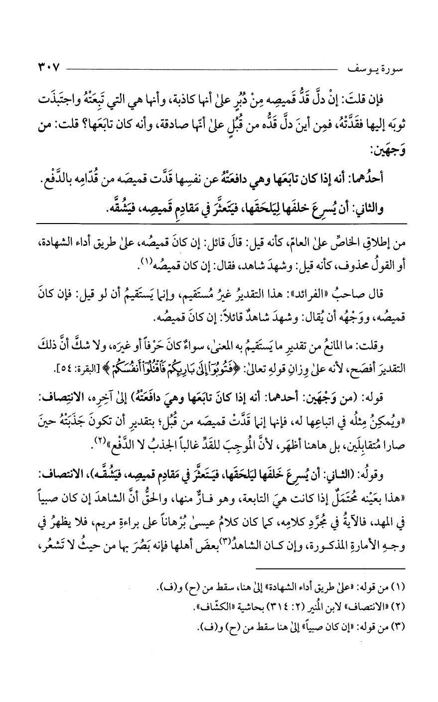 وقوله: (الثاني: أن يسرع خلفها ليلحقها، فيتعثر في مقادم قميصه، فيشقه)، الانتصاف: "هذا بعينه محتمل إذا كانت هي التابعة، وهو فار منها، والحق أن الشاهد إن كان صبياً في المهد، فالآية في مجرد كلامه، كما كان كلام عيسى برهاناً على براءة مريم، فلا يظهر في وجه الأمارة المذكورة، وإن كنا الشاهد بعض أهلها فإنه بصر بها من حيث لا تشعر،