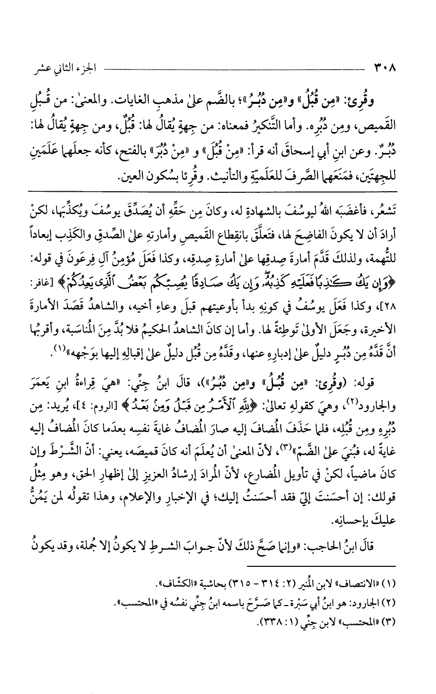 قوله: (وقرئ: "من قُبُل" و"من دبر")، قال ابن جني: "هي قراءة ابن يعمر والجارود، وهي كقوله تعالى: (لِلَّهِ الأَمْرُ مِنْ قَبْلُ وَمِنْ بَعْدُ) [الروم: 4]، يريد: من دبره ومن قبله، فلما حذف المضاف إليه صار المضاف غاية نفسه بعدما كان المضاف إليه غاية له، فبني على الضم"، لأن المعنى أن يعلم أنه كان قميصه، يعني: أن الشرط وإن كان ماضياً، لكن في تأويل المضارع، لأن المراد إرشاد العزيز إلى إظهار الحق، وهو مثل قولك: إن أحسنت إلي فقد أحسنت إليك؛ في الإخبار والإعلام، وهذا تقوله لمن يمن عليك بإحسانه.