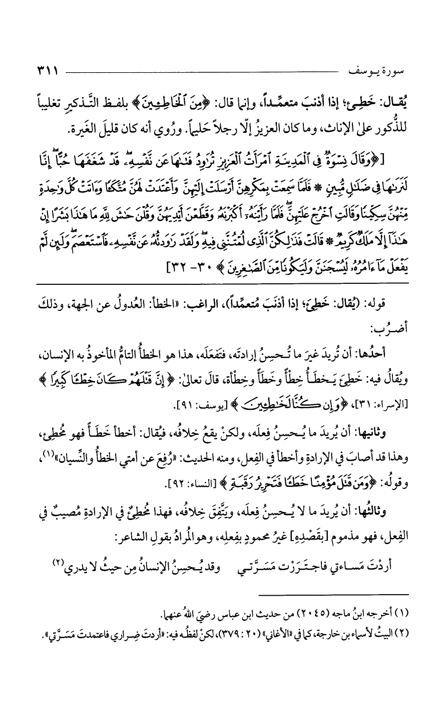 وثانيها: أن يريد ما يحسن فعله، ولكن يقع خلافه، فيقال: أخطأ خطأ فهو مخطئ، وهذا قد أصاب في الإرادة وأخطأ في الفعل، ومنه الحديث: "رفع عن أمتي الخطأ والنسيان"، وقوله: (وَمَنْ قَتَلَ مُؤْمِناً خَطَأً فَتَحْرِيرُ رَقَبَةٍ) [النساء: 92].