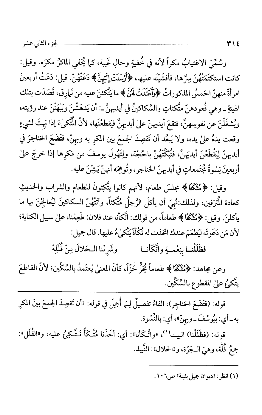 وقيل: (متكأ) مجلس طعام لأنهم كانوا يتكؤن للطعام والشراب والحديث كعادة المترفين، ولذلك: نهي أن يأكل الرجل متكئا» وآتتهنّ السكاكين ليعالجن بها ما يأكلن. وقيل (مُتَّكَأً) طعاما، من قولك اتكأنا عند فلان: طعمنا، على سبيل الكناية، لأن من دعوته ليطعم عندك اتخذت له تكأة يتكئ عليها. قال جميل: