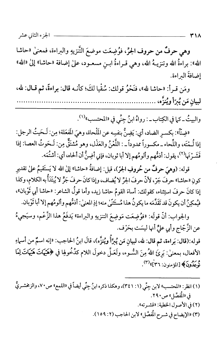 وهي حرف من حروف الجر، فوضعت موضع التنزيه والبراءة، فمعنى «حاشا الله» براءة الله وتنزيه الله، وهي قراءة ابن مسعود، على إضافة حاشا إلى الله إضافة البراءة.