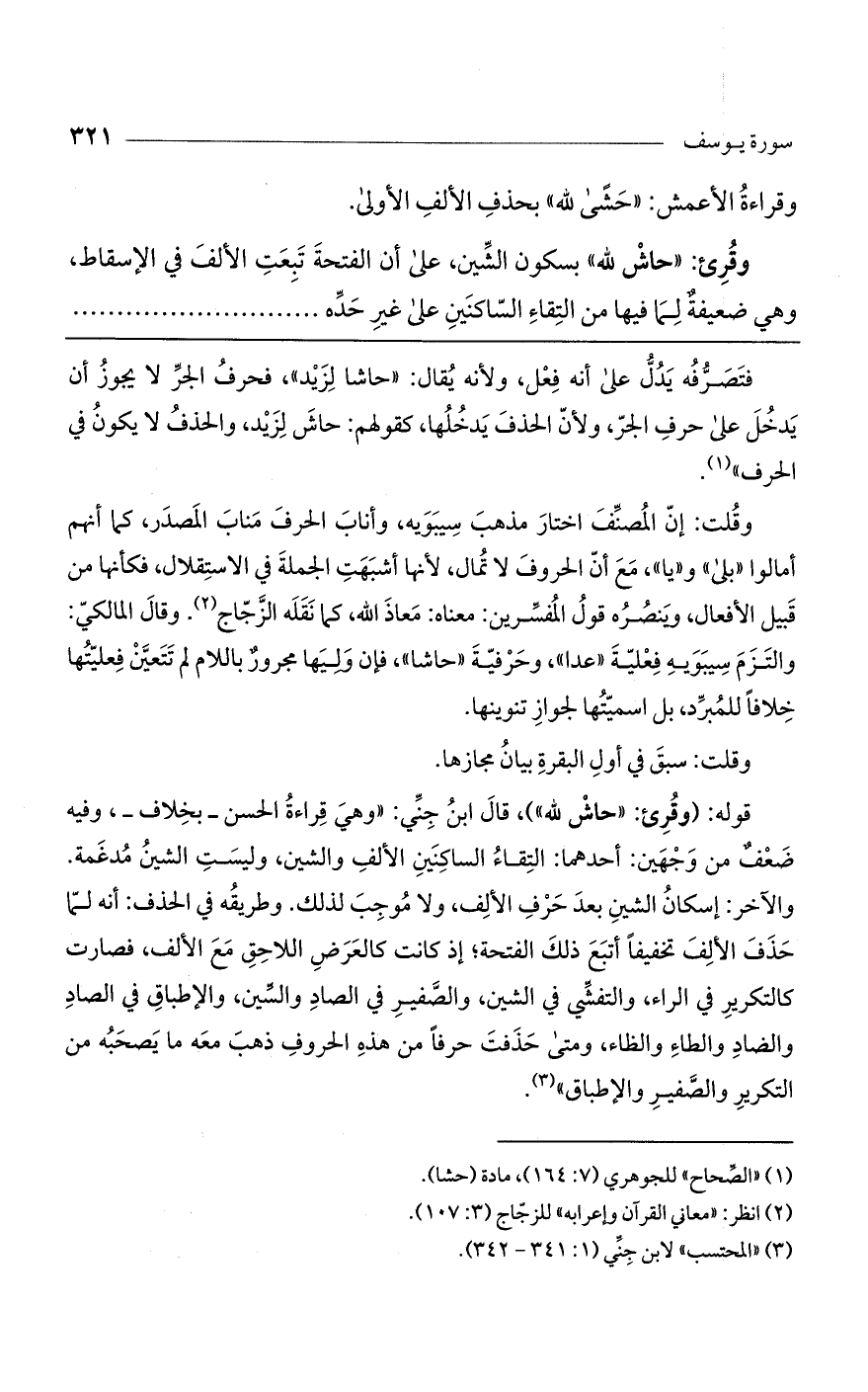 وقراءة الأعمش حاشَ لِلَّهِ بحذف الألف الأولى.