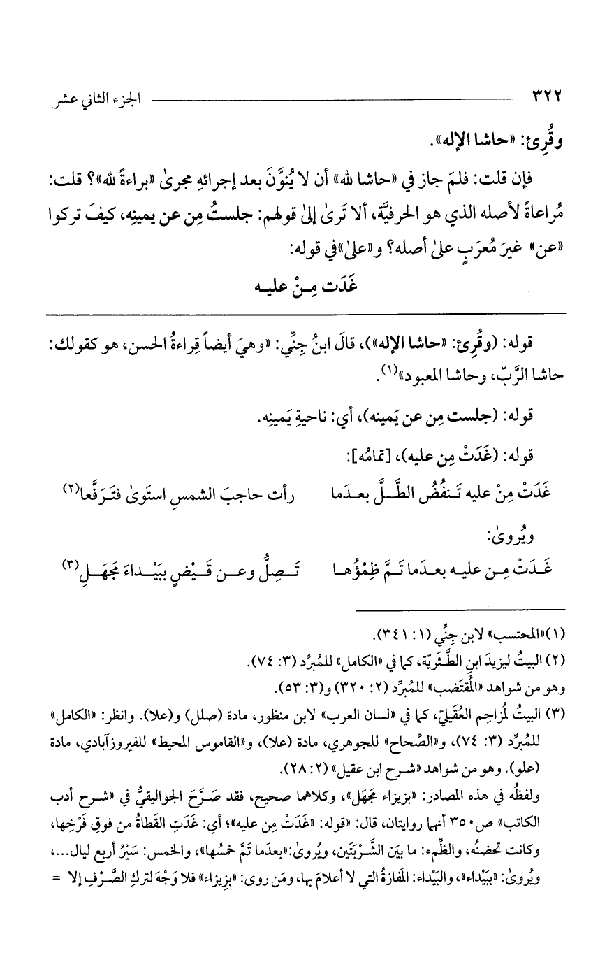 فإن قلت: فلم جاز في حاشا لله أن لا ينوّن بعد إجرائه مجرى: براءة لله؟ قلت: مراعاة لأصله الذي هو الحرفية. ألا ترى إلى قولهم: جلست من عن يمينه، كيف تركوا «عن» غير معرب على أصله؟ وعلى في قوله: