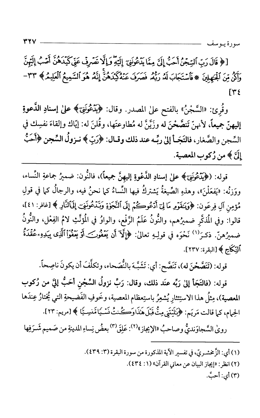 قوله: (يَدْعُونَنِي) على إسناد الدعوة إليهن جميعاً)، فالنون: ضمير جماعة النساء، ووزنه: "يفعلن"، وهذه الصيغة يشترك فيها النساء كما نحن فيه، والرجال كما في قول مؤمن آل فرعون: (وَيَا قَوْمِ مَا لِي أَدْعُوكُمْ إِلَى النَّجَاةِ وَتَدْعُونَنِي إِلَى النَّارِ) [غافر: 41]، قالوا: وفي المذكر ضميرهم، والنون علم الرفع، والواو في المؤنث لام الفعل، والنون ضميرهن. ذكر نحوه في قوله تعالى: (إِلاَّ أَنْ يَعْفُونَ أَوْ يَعْفُوَ الَّذِي بِيَدِهِ عُقْدَةُ النِّكَاحِ) [البقرة: 237].