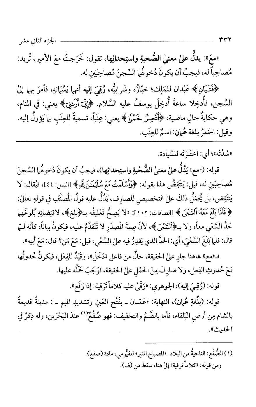 قوله: ("مع" يدل على معنى الصحبة واستحداثها)، فيجب أن يكون دخولهما السجن مصاحبين له، قيل: ينتقض هذا بقوله: (وَأَسْلَمْتُ مَعَ سُلَيْمَانَ لِلَّهِ) [النمل: 44]، فيقال: لا ينتقض، بل يحمل ذلك على التخصيص للصارف، يدل عليه قول المصنف في قوله تعالى: (فَلَمَّا بَلَغَ مَعَهُ السَّعْيَ) [الصافات: 102]: "لا يصح تعليقه بـ (بلغ)، لاقتضائه بلوغهما حد السعي معاً، ولا بـ (السَّعْيَ)، لأن صلة المصدر لا تتقدم عليه، فيكون بياناً، كأنه لما قال: فلما بلغ السعي، أي: الحد الذي يقدر فيه على السعي، قيل: مع من؟ قال: مع أبيه".