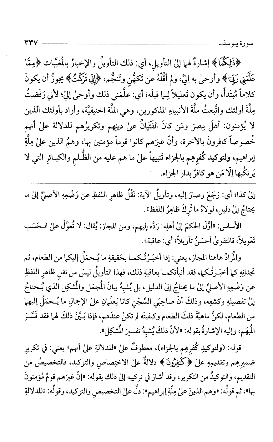 والمراد ها هنا المجاز، يعني: إذا أخبرتكما بحقيقة ما يحمل إليكما من الطعام، ثم تجدانه كما أخبرتكما، فقد أنبأتكما بعاقبة ذلك، فهذا التأويل ليس من نقل ظاهر اللفظ عن وضعه الأصلي إلى ما يحتاج إلى الدليل، بل يشبه بيان المجمل والمشكل الذي يحتاج إلى تفصيله وكشفه، وذلك أن صاحبي السجن كانا يعلمان على الإجمال ما يحمل إليهما من الطعام، لكن ماهية ذلك الطعام وكيفيته لم تكن عندهم، فإذا بين ذلك لهما فقد فسر المبهم، وإليه الإشارة بقوله: "لأن ذلك يشبه تفسير المشكل".