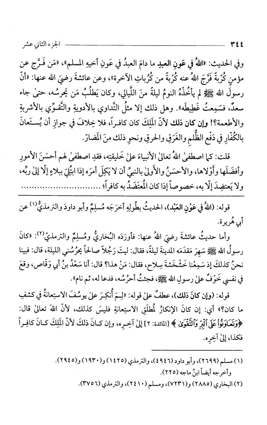 وفي الحديث «الله في عون العبد ما دام العبد في عون أخيه المسلم»، «من فرّج عن مؤمن كربة فرّج الله عنه كربة من كربات الآخرة»، وعن عائشة رضي الله عنها: "أنّ رسول الله صلى الله عليه وسلم لم يأخذه النوم ليلة من الليالي، وكان يطلب من يحرسه حتى جاء سعد فسمعت غطيطه". وهل ذلك إلا مثل التداوي بالأدوية والتقوّى بالأشربة والأطعمة؟ ! وإن كان ذلك لأنّ الملك كان كافراً، فلا خلاف في جواز أن يستعان بالكفار في دفع الظلم والغرق والحرق ونحو ذلك من المضارّ.