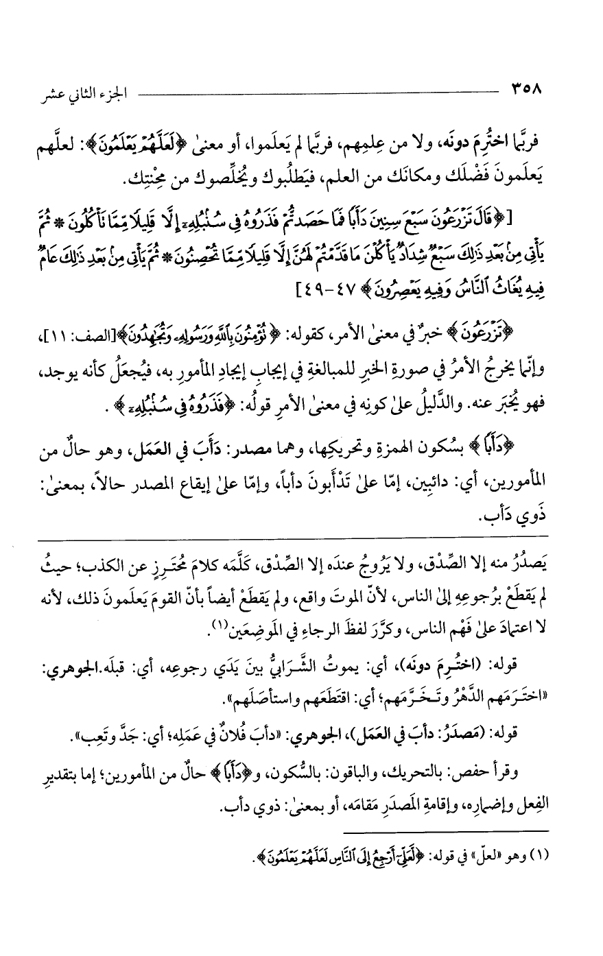وقرأ حفص: بالتحريك، والباقون: بالسكون، و (دَأَباً) حال من المأمورين؛ إما بتقدير الفعل وإضماره، وإقامة المصدر مقامه، أو بمعنى: ذوي دأب.