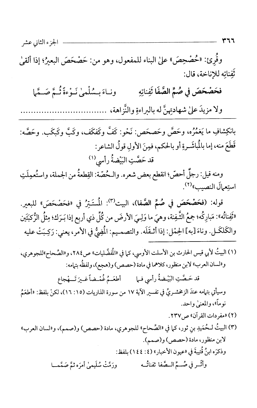 بانكشاف ما يغمره، وحص وحصحص: نحو: كف وكفكف، وكب وكبكب. وحصه: قطع منه، إما بالمباشرة أو بالحكم، فمن الأول قول الشاعر: