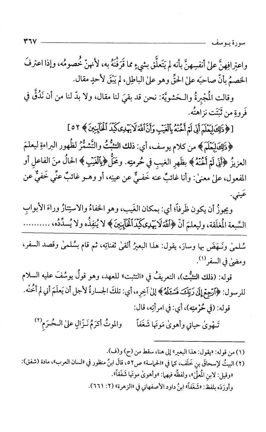 (ذلِكَ لِيَعْلَمَ) من كلام يوسف، أي: ذلك التثبت والتشمر لظهور البراءة ليعلم العزيز (أَنِّي لَمْ أَخُنْهُ) بظهر الغيب في حرمته. ومحل (بِالْغَيْبِ) الحال من الفاعل أو المفعول، على معنى: وأنا غائب عنه خفي عن عينه أو وهو غائب عني خفي عن عيني.