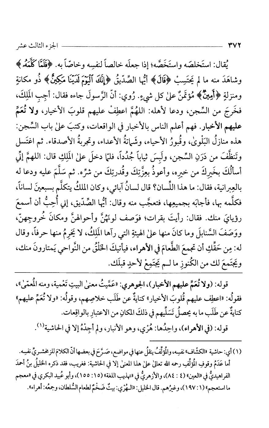 الأصدقاء، ثم اغتسل وتنظف من درن السجن، ولبس ثيابا جدداً» فلما دخل على الملك قال: اللهمّ إني أسألك بخيرك من خيره، وأعوذ بعزتك وقدرتك من شره، ثم سلم عليه ودعا له بالعبرانية، فقال: ما هذا اللسان؟ قال: لسان آبائي، وكان الملك يتكلم بسبعين لساناً، فكلمه بها فأجابه بجميعها، فتعجب منه وقال: أيها الصدّيق، إني أحب أن أسمع رؤياي منك. فقال: رأيت بقرات فوصف لونهنّ وأحوالهنّ ومكان خروجهنّ، ووصف السنابل وما كان منها على الهيئة التي رآها الملك لا يخرم منها حرفاً، وقال له: من حقك أن تجمع الطعام في الأهراء، فيأتيك الخلق من النواحي يمتارون منك، ويجتمع لك من الكنوز ما لم يجتمع لأحدٍ قبلك.