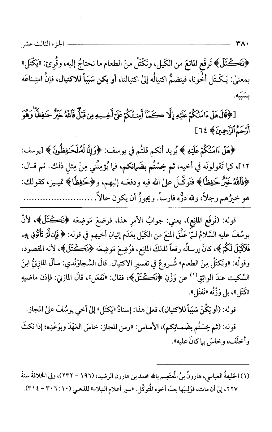قوله: (نرفع المانع)، يعني: جواب الأمر هذا، فوضع موضعه (نَكْتَلْ)، لأن يوسف عليه السلام لما علق المنع من الكيل بعدم إتيان أخيهم في قوله: (فَإِنْ لَمْ تَاتُونِي بِهِ فَلا كَيْلَ لَكُمْ)، كان إرساله رفعاً لذلك المانع، فوضع موضعه (نَكْتَلْ)، لأنه المقصود، وقوله: "ونكتل من الطعام" شروع في تفسير الاكتيال. قال السجاوندي: سأل المازني ابن السكيت عند الواثق عن وزن (نَكْتَلْ)، فقال: "نفعل"، قال المازني: فإذن ماضيه "كتل"، بل وزنه "نفتل".