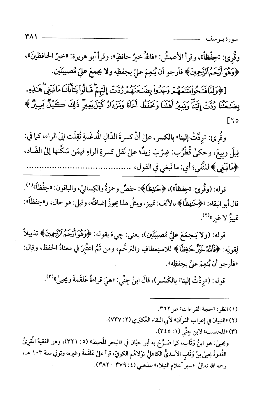 قوله: (وقرئ: "حفظاً")، (حَافِظاً): حفص وحمزة والكسائي، والباقون: "حفظاً". قال أبو البقاء: " (حَافِظاً) بالألف: تمييز، ومثل هذا يجوز إضافته، وقيل: هو حال، و"حفظاً": تمييز لا غير".