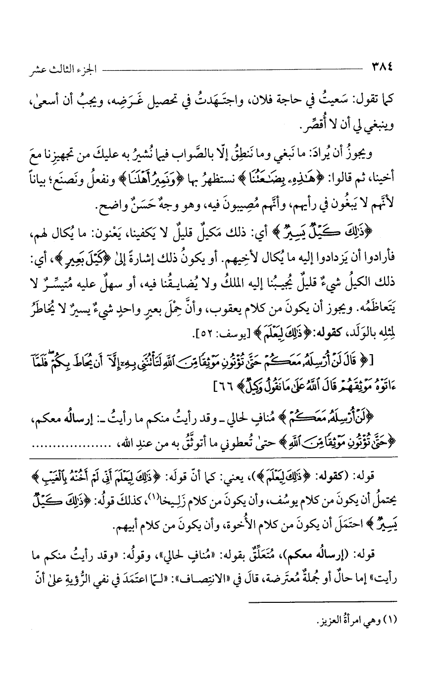 قوله: (كقوله: (ذَلِكَ لِيَعْلَمَ))، يعني: كما أن قوله: (ذَلِكَ لِيَعْلَمَ أَنِّي لَمْ أَخُنْهُ بِالْغَيْبِ) يحتمل أن يكون من كلام يوسف، وأن يكون من كلام زليخا، كذلك قوله: (ذَلِكَ كَيْلٌ يَسِيرٌ) احتمل أن يكون من كلام الأخوة، وأن يكون من كلام أبيهم.